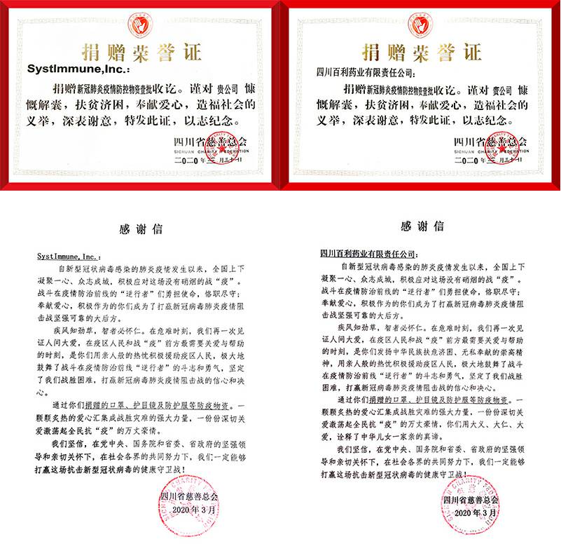 扬州夏宇翻译及本地化有限公司携手美国西雅图免疫,中美企业共同通过四川慈善总会,向四川和湖北等一线医院分批次捐赠医用外科口罩和N95口罩、护目镜、防护服等防护用品。向全国几十家医院捐赠抗病毒药物新博林(利巴韦林颗粒)和提高免疫的好好黄芪颗粒等,助力一线医护抗疫